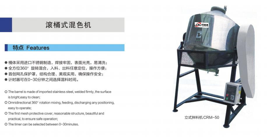 桶體采用進口不銹鋼制造,焊接牢固,表面光亮,易清洗;全方位360°旋轉混合,入料、出料任意定位,操作方便;首創網孔保護罩,結構合理、美觀實用,確保操作安全;計時器可在0-30分鐘之間選擇混料時間。